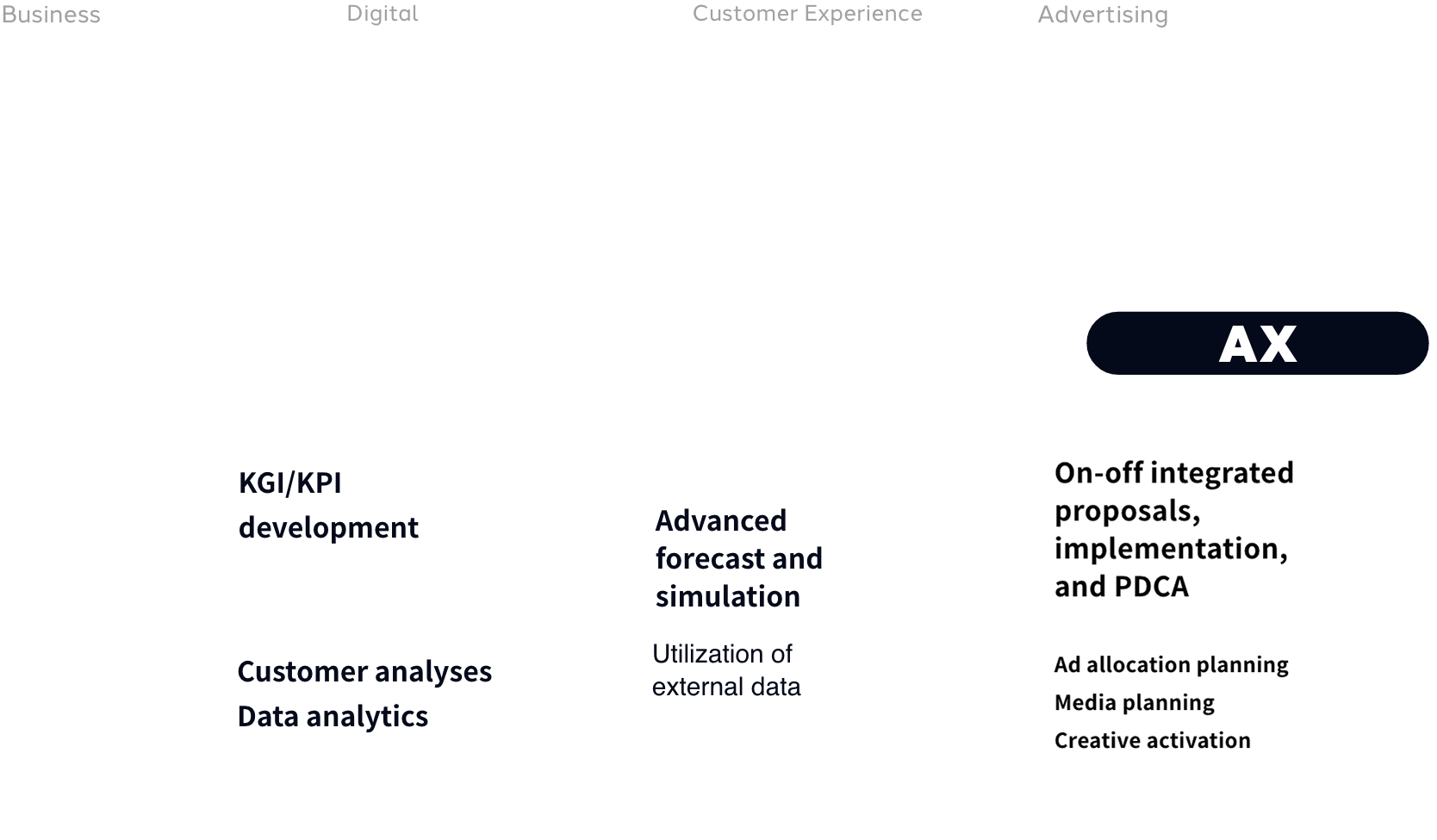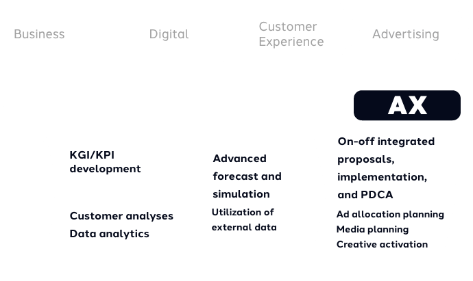 Always grounded in customer standpoint, we propose seamless measures to maximize ad performance. We are always committed to results by realizing agile foundation building that lead to appropriate next steps.