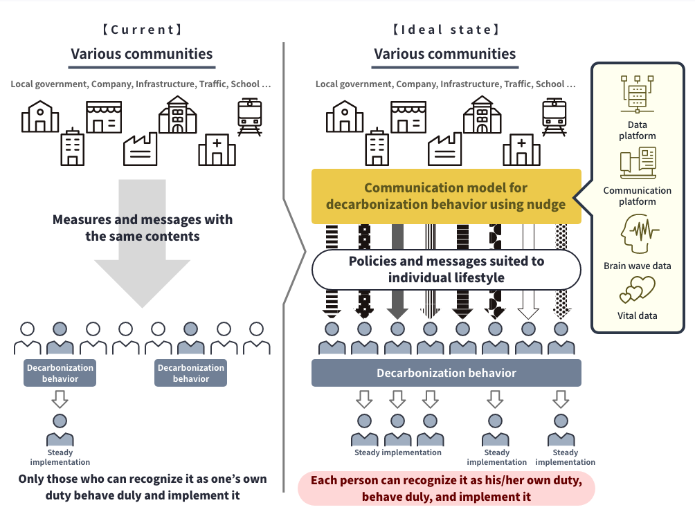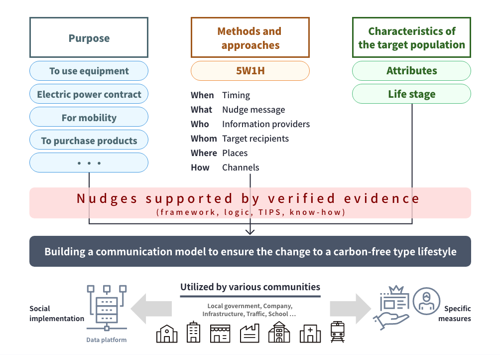 One of the keys to realizing a carbon-free society is to promote behavior transformation with a carbon-free focus in toC and toB communications, as well as ensure new behaviors become permanent. To aid this ‘behavior transformation via nudge’ process, the attributes and tastes of the target need to be known to ensure personalization and implementation, which we obtain via detailed analyses on the 5W1H (or When: in what sort of condition, at what timing, Where: at which place, Who: from what kind of actor, What: by what sort of appeal method, Why: why such a change occurred, and How: by what method) and by visualizing the associated emotions. These systemized items form a component of the communication model we constructed, the use of which could help expand the market for carbon-free type products and services, thus helping reduce CO2 emissions centered on the household segment.