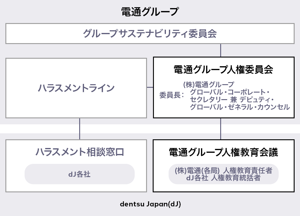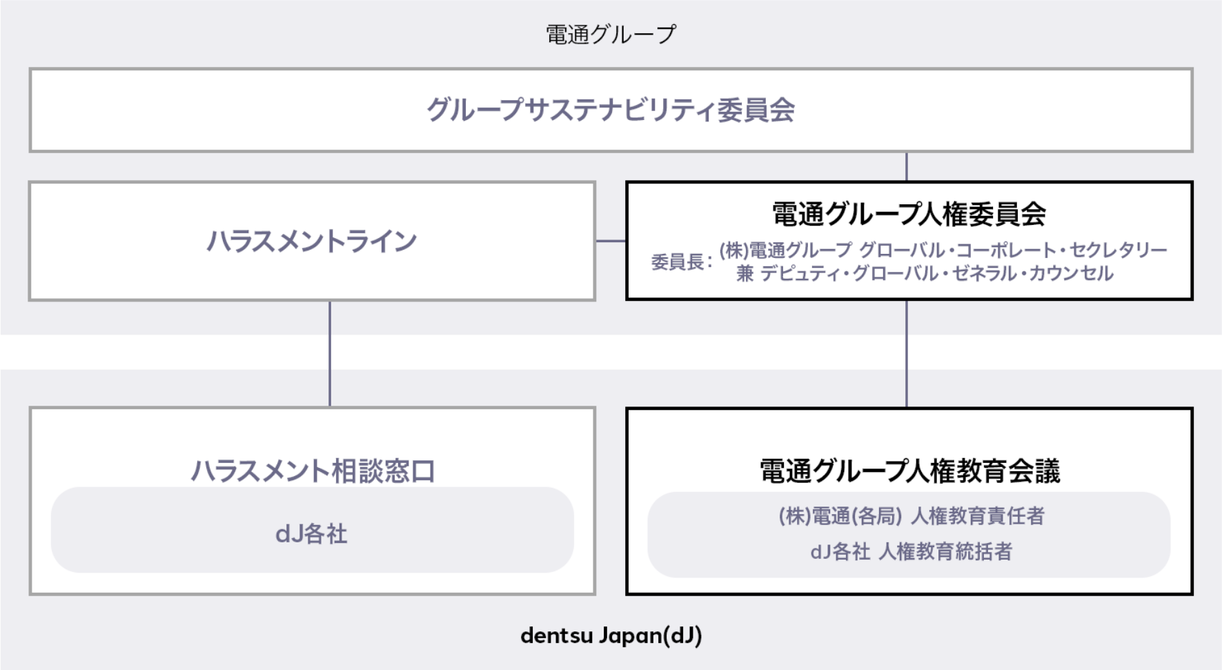 dentsu Japanでは経営層からなる「人権委員会」(年2回開催)とdentsu Japan各社の人権担当者が参加する「人権教育会議」(年2回開催)を設置し、人権啓発の計画や活動実績、課題などについて共有する体制を構築しています。