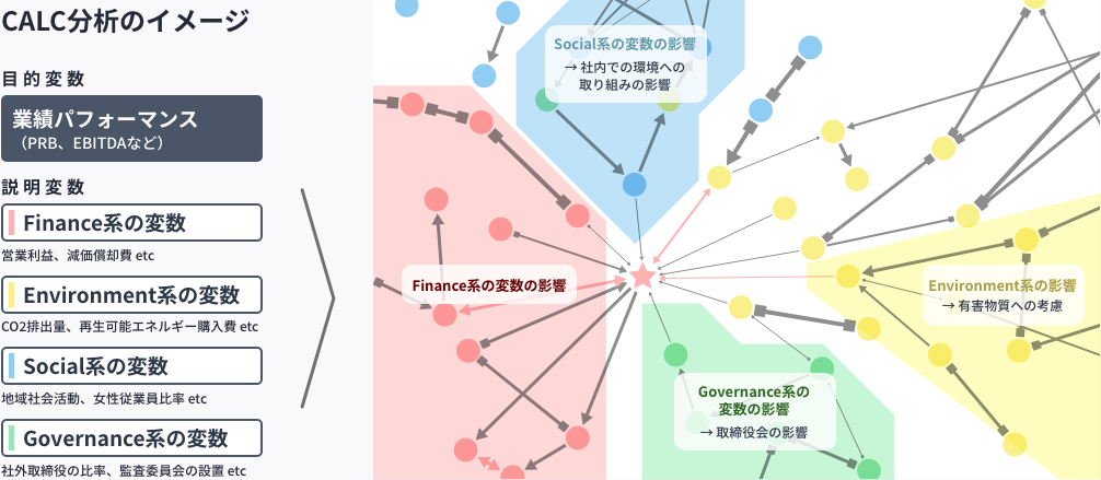 投資家が行うESG投資ならびに消費者のESGに配慮した商品に対する購買意識の高まりなどを受けて、日本企業でESG経営を推進する動きが広がっています。しかし、ESGの取り組みが業績に与える影響は、複数の要因に影響を与えた結果として表れることが多く、把握をしづらいため、どの施策を優先的に取り組むべきかの意思決定やステークホルダーへの説明が難しいという課題がありました。CALC*1は従来の解析手法では推定が難しいデータ内関係因子における直接的な要因・原因を抽出すること(因果分析)が可能な技術です。注目する業績指標に対して、どのESGの取り組みが因果的に関係しているかをネットワーク図を用いて可視化することで、「施策のポイント」が明確になります。