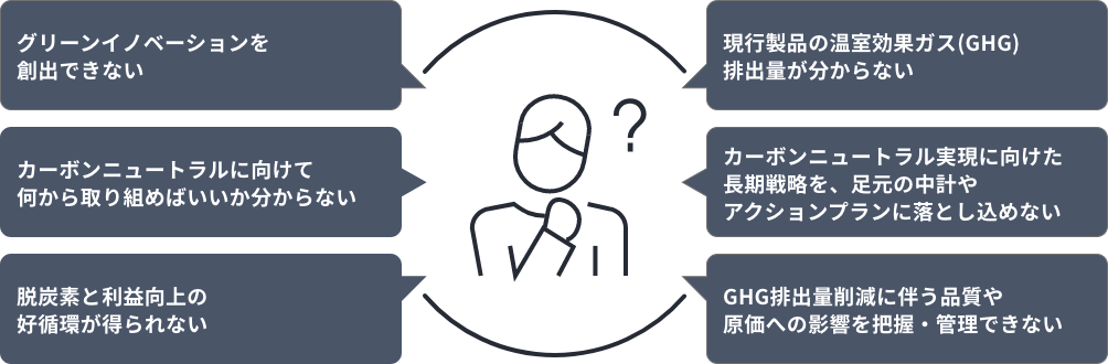 企業の持続的な存続・成長、サステナブルな社会の実現のため、多くの企業がカーボンニュートラルという課題に直面しています。ひと昔前までは、「カーボンニュートラルは経営企画部門や環境部門が考える経営課題」と捉えられがちでしたが、今では、製造業の商品企画部門、開発部門、生産部門のような現場部門の方々からも、上図に示すような悩みの声が聞かれます。