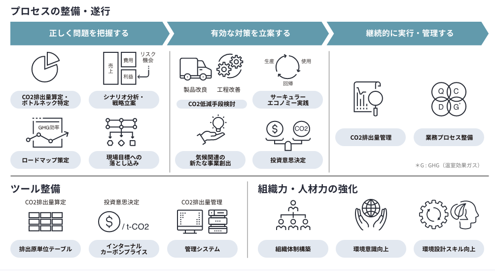 このような悩みを解決し、カーボンニュートラルを実現するには、プロセスを整備し、遂行することが肝要です。また、ツール整備や組織力・人材力強化を行い、プロセス遂行力を最大化する必要があります。